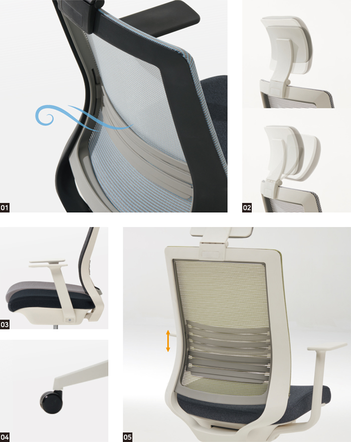 ① 메쉬 등판 : 메쉬 고유의 우수한 신축성과 통기성에 더해 따뜻한 질감과 부드러운 촉감을 보유한 최신 메쉬 패브릭으로 등판을 마감했습니다. (등판은 뒤로 최대 16.5˚ 젖혀집니다.)