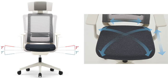 자유롭게 출렁이는 듯한 좌판 움직임(Movement)이 가능하도록 롤링 틸트(Rolling Tilit)라는 획기적인 틸팅 메커니즘을 세계 최초로 개발 장착했습니다. 이는 사용자로 하여금 고정된 자세가 아니라 원하는 방향으로 자연스럽게 출렁이듯 움직이며 일할 수 있게 해주며, 대퇴부와 허리에 가해지는 지속적인 압력을 분산시켜 혈액 순환을 돕고 장시간 착석에 따른 사용자의 피로도를 크게 줄이며, 업무 집중력을 대폭 향상시켜 줍니다. 등판도 좌판의 움직임에 연동되어 동시에 움직이기에 사용자의 등을 더욱 적극적으로 지지해 줍니다.