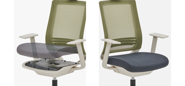 ③ 등판도 좌판의 움직임에 연동되어 동시에 움직이기에 사용자의 등을 더욱 적극적으로 지지해 줌